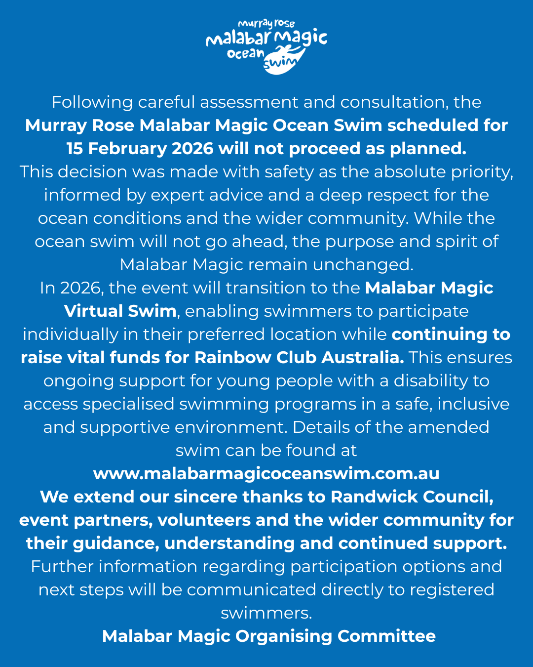 Following careful assessment and consultation, the Murray Rose Malabar Magic Ocean Swim scheduled for 15 February 2026 will not proceed as planned. This decision was not made lightly and with safety as the absolute priority.